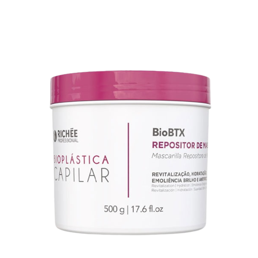 Richée Bioplástica BioBTx Mass Repositor is the ideal treatment for those who want to tame their hair, reduce volume, and restore hair health with shine and softness. With a formula rich in vegetable oils, natural extracts, and hydrolyzed keratin , it fills damaged areas of the hair fiber, promoting intense hydration, deep nourishment, and frizz control .