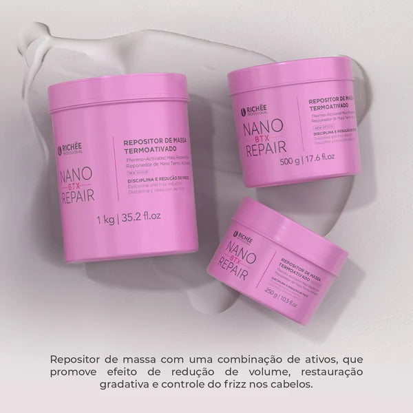 Recupere a vitalidade dos seus fios com o Richée NanoBtx Repair Termoativado, o repositor de massa ideal para cabelos danificados por químicas, coloração ou agressões externas. Sua fórmula avançada reconstrói as áreas fragilizadas da fibra capilar, nutre profundamente, sela as cutículas e promove um efeito liso duradouro, com redução de volume de até 100%.
